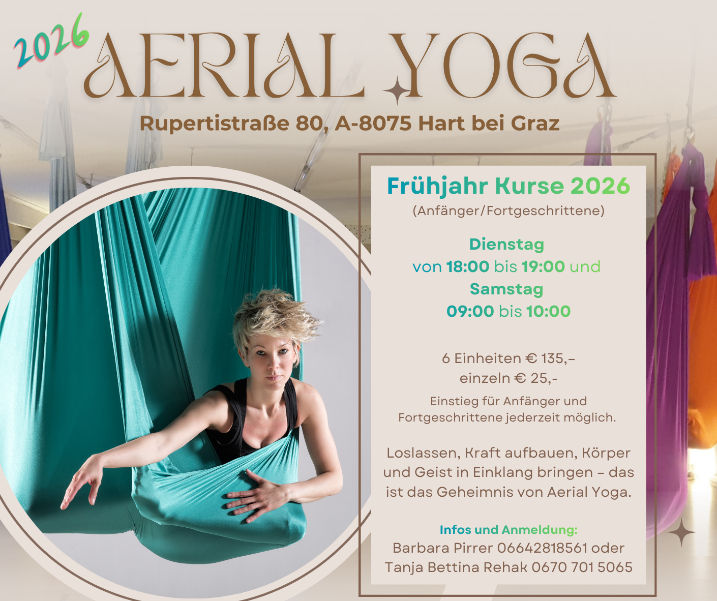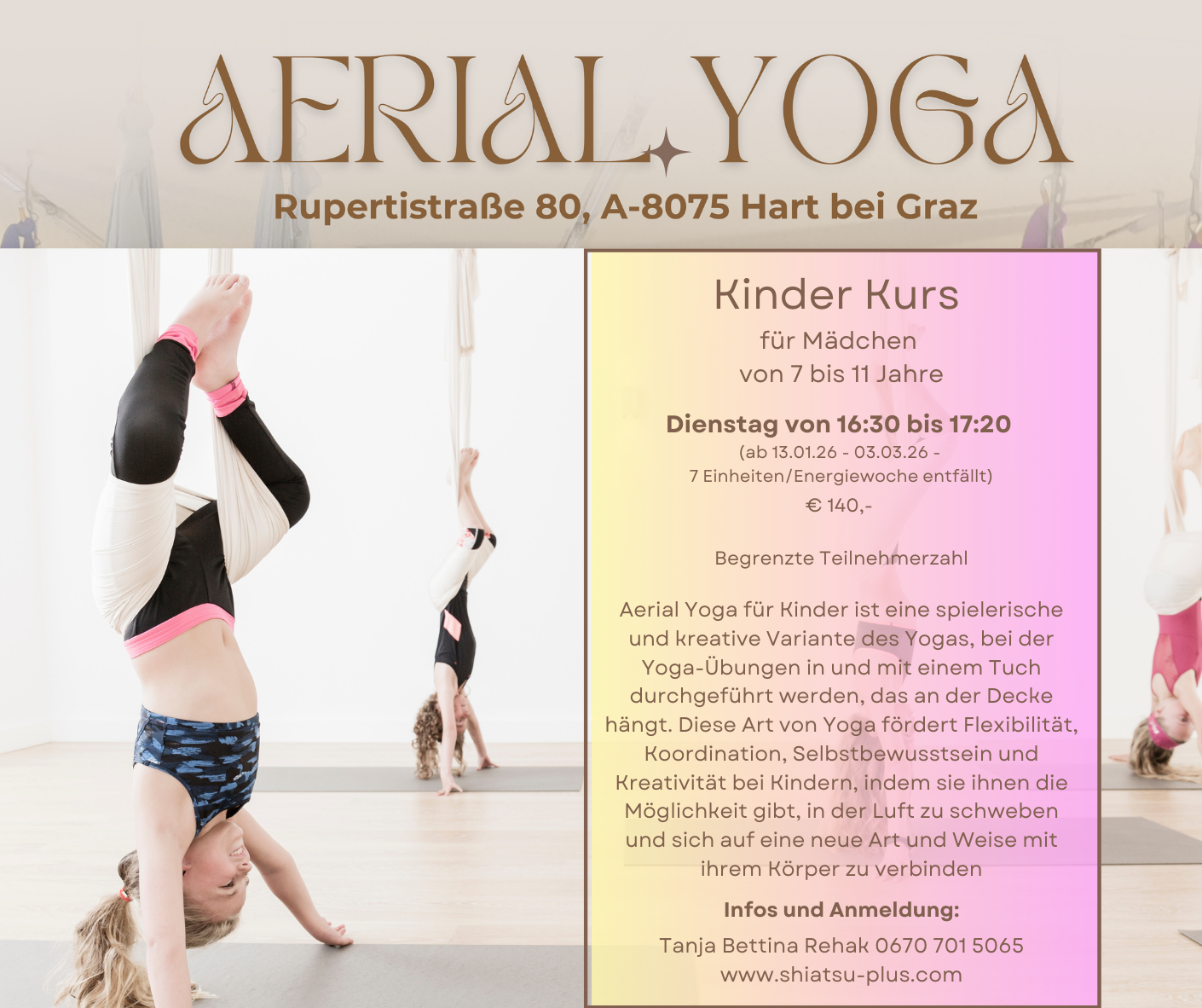 Das Tuch passt sich deinem Körper an und reagiert auf deine Bewegungen. Aerial Yoga kann auch als kreatives und spielerische Yoga bezeichnet werden und trägt zum „wieder Kind sein“ bei. Kinder lieben es, in den Lüften zu schweben, akrobatische Figuren auszuprobieren, oder sichs einfach im Tuch gemütlich zu machen.